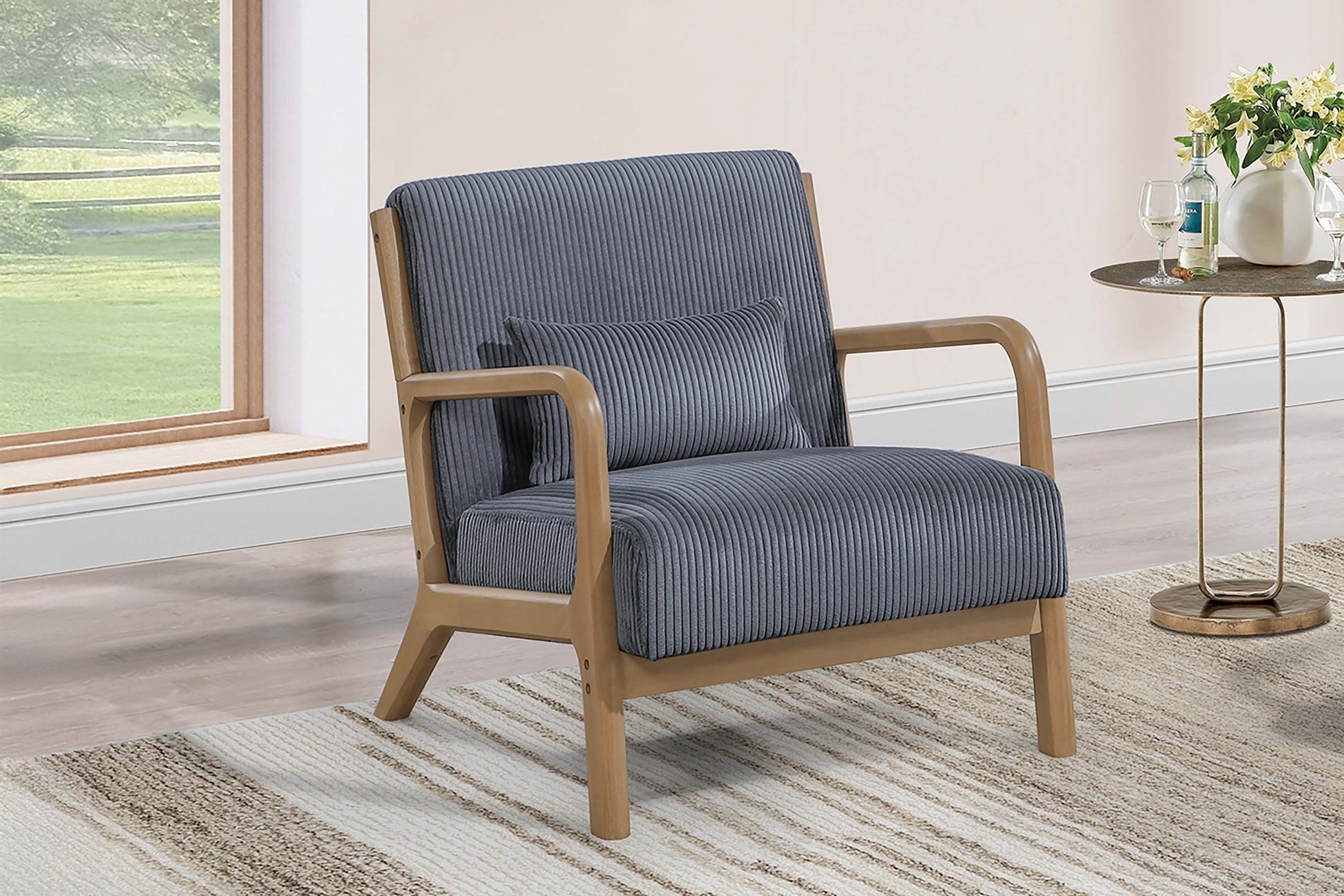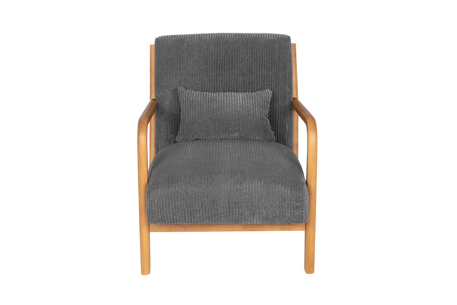 Bring effortless style and comfort into your home with this modern accent chair. Its sleek silhouette is perfect for small spaces or as an eye-catching piece in larger rooms. The short legs give it a low-profile look, while the slanted back legs create a naturally reclined angle, encouraging you to sit back and relax. The arms flow downward in a soft, curved shape, adding to the chair’s modern appeal and inviting feel. The seat and back are wrapped in soft corduroy fabric, combining a cozy texture with a clean, contemporary silhouette. A small, matching pillow adds just the right amount of comfort and completes the design with a thoughtful touch. Whether styled in a living room, bedroom, or reading nook, this accent chair blends modern design with everyday comfort for a look that feels as good as it looks.