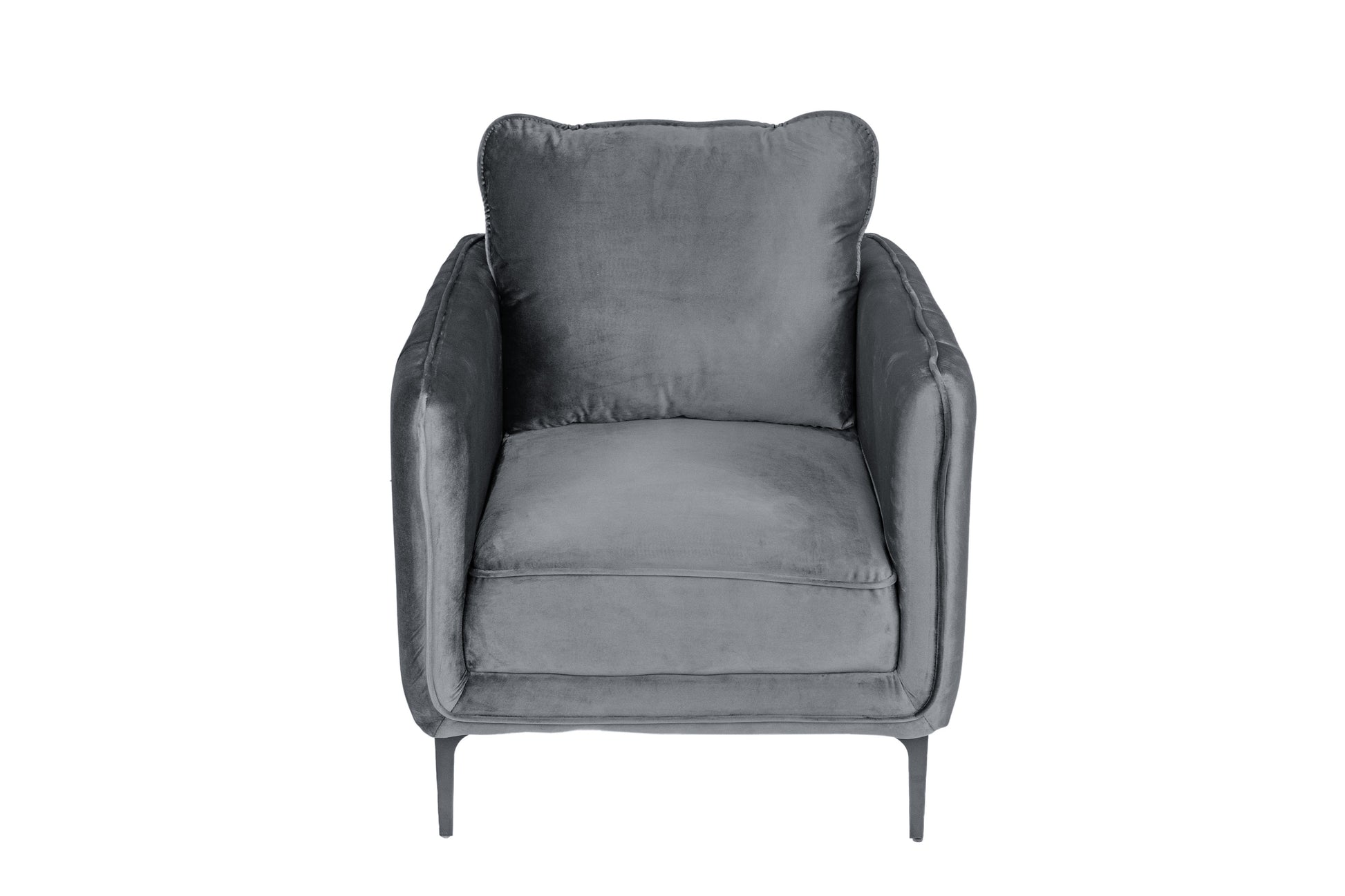 Add a rich layer of elegance to your living space with this beautifully designed accent chair. This chair makes a sophisticated statement while offering a comfortable place to unwind. Upholstered in plush velvet, it brings a refined texture that complements both modern and classic interiors. The armchair’s silhouette is sleek and structured, with a clean profile that blends comfort and style. Vertical channel tufting lines the sides of the arms, adding dimension and visual appeal. This detailing enhances the chair’s modern feel while subtly nodding to Contemporary influences. The back cushion is removable, allowing for easy fluffing or repositioning to suit your seating preference. Supported by striking L-shaped metal legs, this chair brings a touch of contemporary flair. The bold contrast between the dark upholstery and the sleek metal base creates a balanced and eye-catching look. Whether styled on its own as a statement piece or placed in a pair to frame a sofa or fireplace, this chair offers both design presence and everyday use. Available in rich dark tones, it blends effortlessly into a wide range of color schemes—from neutral palettes to more moody, dramatic interiors. Ideal for living rooms, reading corners, this accent chair is more than just a seat—it’s a design element that enhances the atmosphere of any room.